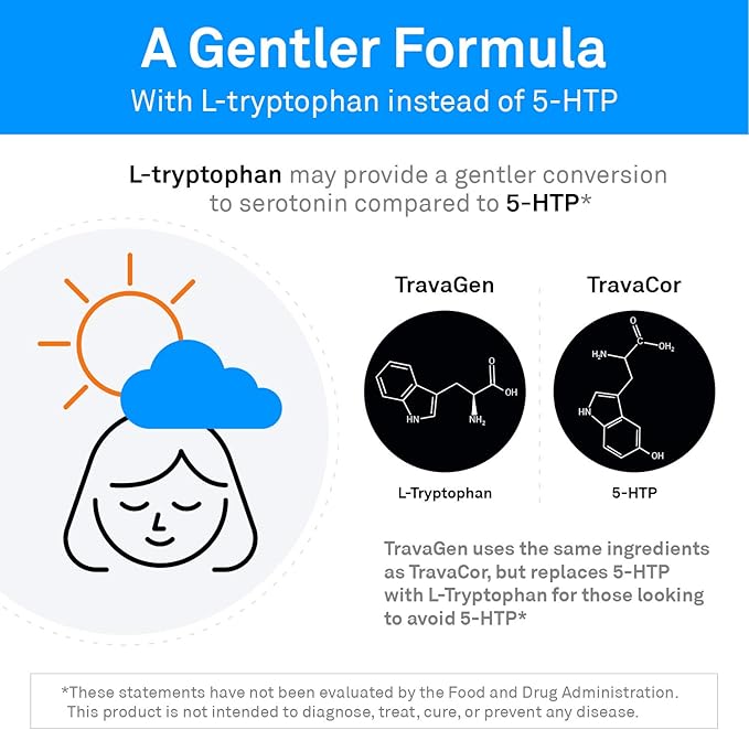 - Gentler Support - Unlike TravaCor (our best-selling mood + calm aid), TravaGen does not contain a 5 HTP supplement. Instead, this product uses L tryptophan to provide gentler, slower conversion to serotonin for those who are more sensitive.*