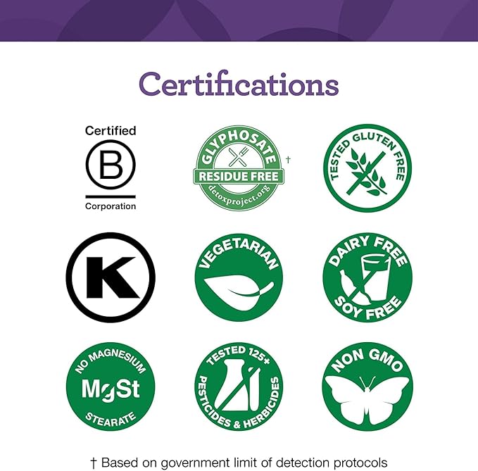 - Put To The Test: Non-GMO; Certified B Corp; Certified Kosher; Tested for over 125 chemical substances; Free of gluten, dairy and soy
