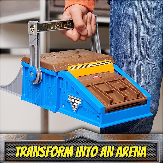 - TRANSFORMING PLAYSET: Transform the stunt set into a portable carrying case by securing the lid and lifting the handle. You can store up to 12 mini Monster Jam trucks