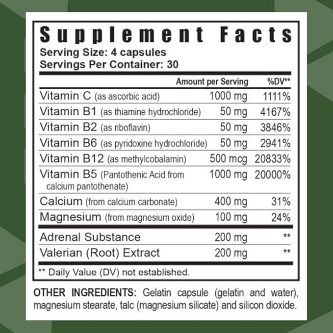 - Special Ingredients : Vitamin C, Vitamin B1, Vitamin B2, Vitamin B6, Vitamin B12, Pantothenic Acid, Calcium, Magnesium, Adrenal Substance, Valerian Root Extract, Vegetable Cellulose MST, Gelatin Capsules Vitamin C, Vitamin B1, Vitamin B2, Vitamin B6, Vitamin B12, Pantothenic Acid, Calcium, Magnesium, Adrenal Substance, Valerian Root Extr… See more
