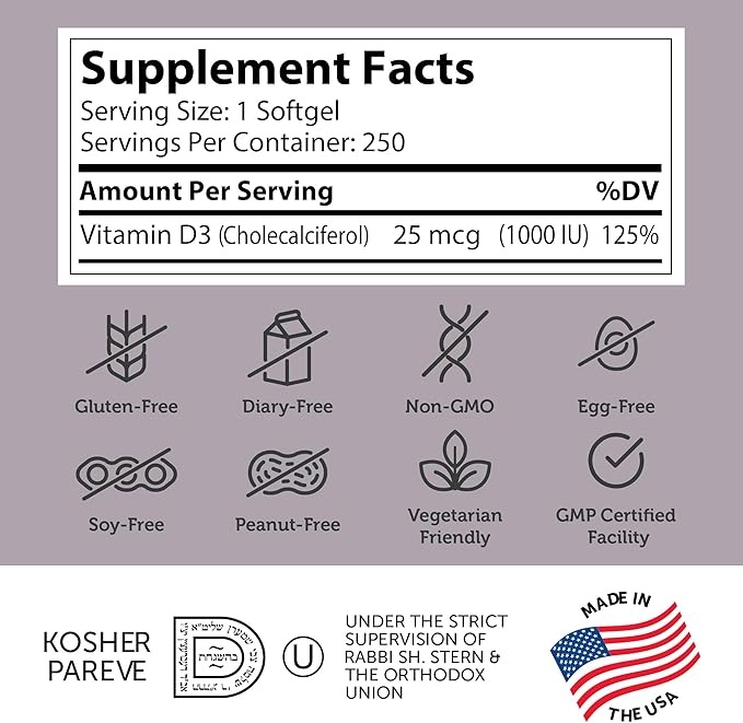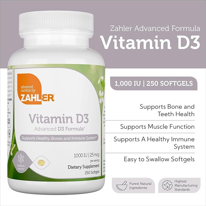 Zahler - Advanced Vitamin D3 1000 IU Softgels (250 Count) Kosher Vegetarian Friendly Vitamin D for Immune Support, Bone, Teeth & Muscle Health - Daily D3 Vitamin Supplement for Adults - Easy Swallow V