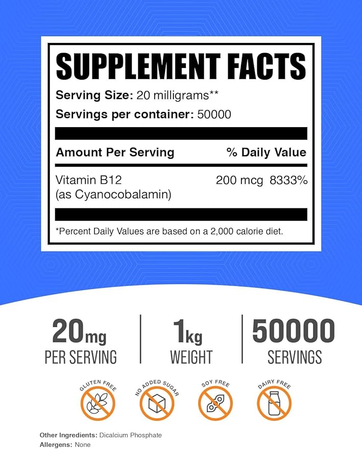 BulkSupplements.com Vitamin B12 Powder - as Cyanocobalamin, Vitamin B Supplement, Vitamin B12 200 mcg - Essential Vitamin, Gluten Free, 20mg per Serving, 1kg (2.2 lbs) (Pack of 1)