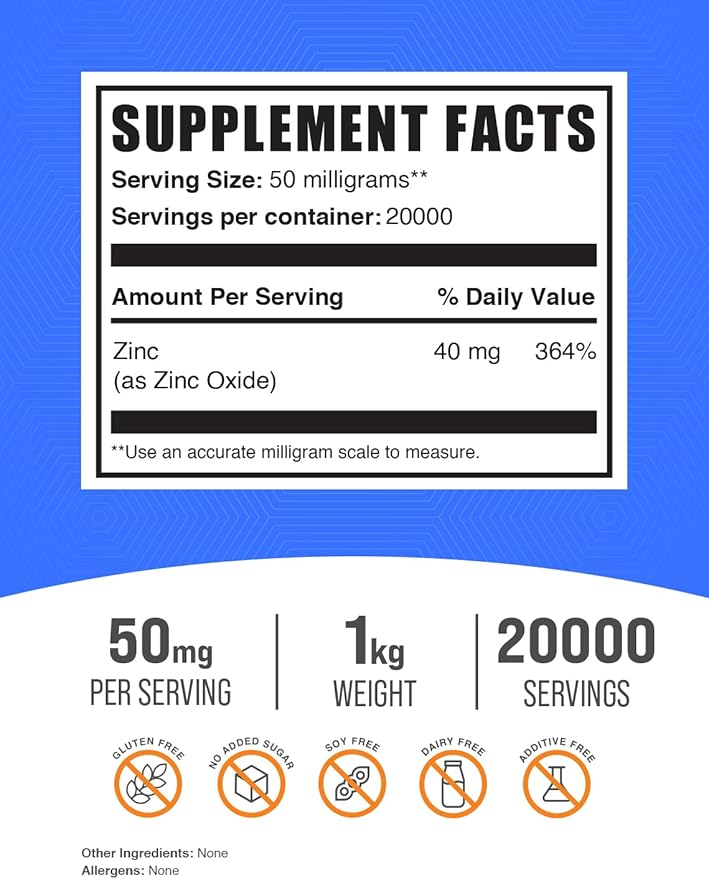 BulkSupplements.com Zinc Oxide Powder - Zinc 40mg, Zinc Oxide Supplement, Zinc Powder for Immune Support - Gluten Free, 50mg per Serving, 1kg (2.2 lbs) (Pack of 1)