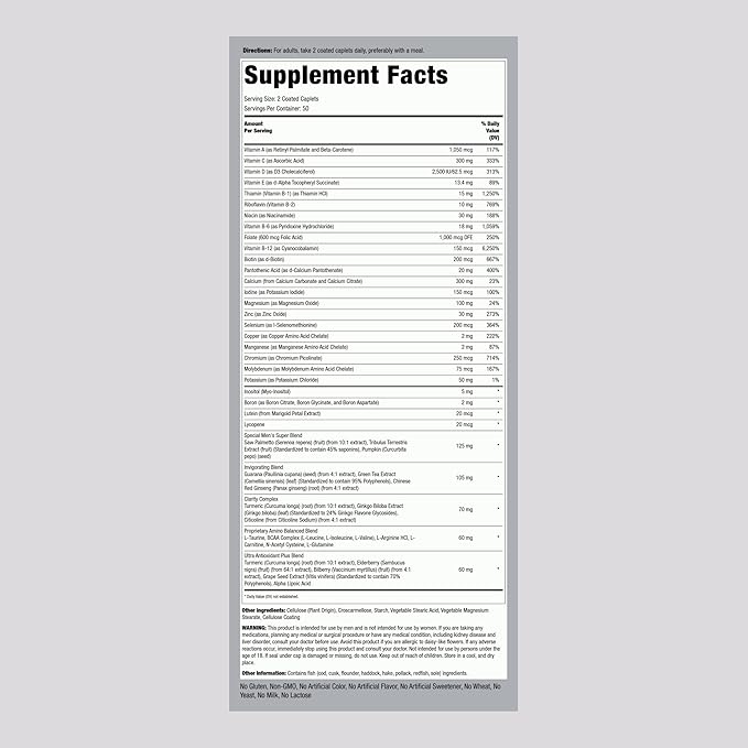 Piping Rock Multivitamin for Men Over 50 Plus | 100 Caplets | with Vitamin D3, Potassium, Folate | Daily Mega Multi Mineral Supplement | Non-GMO, Gluten Free