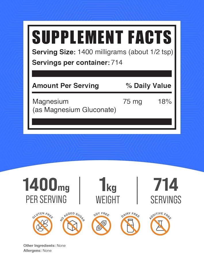 BulkSupplements.com Magnesium Gluconate Powder - Magnesium Gluconate Supplement, Essential & Gluten Free - 1400mg (75mg of Magnesium) per Serving, 1kg (2.2 lbs) (Pack of 1)