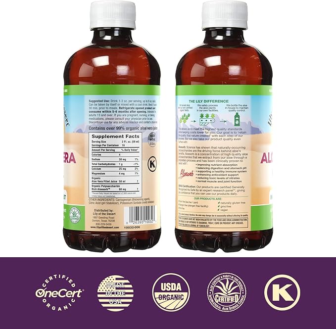 - BIO-ACTIVE ALOE JUICE: Aloe vera, organically grown on Lily of the Desert’s own fields, yields a bio-active juice with a multitude of benefits for your whole body, including your digestive system