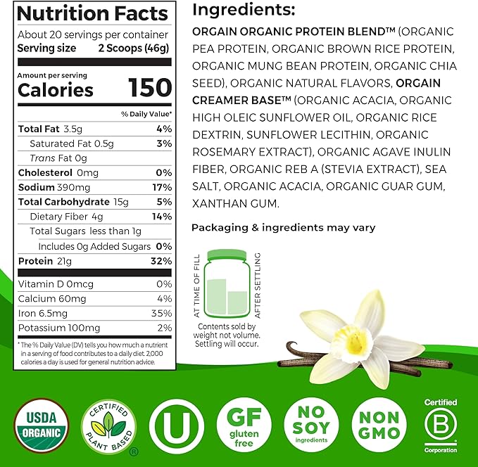 - WHAT TO EXPECT: Includes 1 (2.03 Lb) (20 Servings) (Packaging May Vary) ready to mix Orgain Organic Vanilla Bean Protein Powder. Each serving contains 150 Calories (2 Scoops).