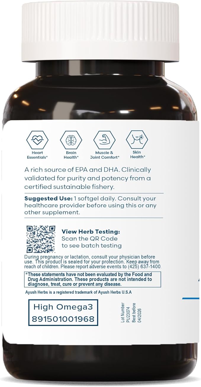 Ayush Herbs High Omega 3 - Omega 3 Fish Oil, 1000mg Per Capsule, EPA & DHA Fish Oil Supplement for Women & Men, Natural Lemon Flavor - 60 Softgel Capsules (1 Count)