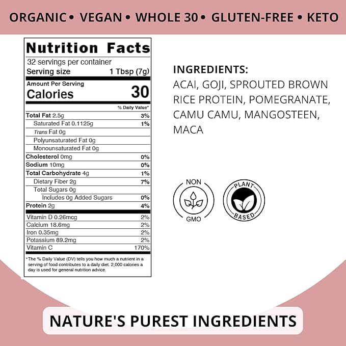 - NUTRIENT-DENSE SUPERFOOD POWDER - Bliss is a nutrient-dense superfood mix that combines organic acai, goji, sprouted brown rice protein, and other wholesome ingredients. It packs more protein than an egg and offers an impressive array of free radical scavengers. This blend is a convenient way to fuel your body with essential nutrients, supporting your overall health and well-being. Experience the nourishing power of this nutrient-dense superfood blend.