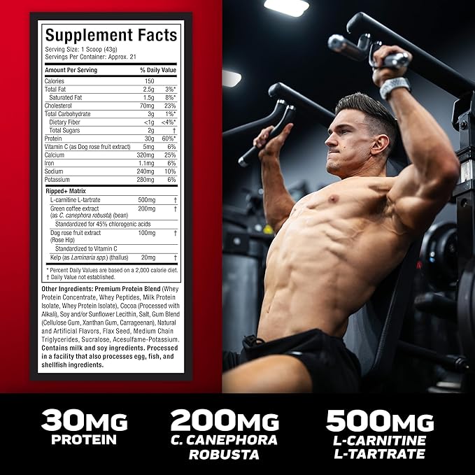 - A Unique Formula: Nitro-Tech Ripped features whey protein peptides and isolate, which are rapidly absorbed by the body. One scoop contains 30g of protein, plus 200 mg of C. canephora robusta and 500 mg of L-carnitine L-tartrate, known metabolism-boosters.