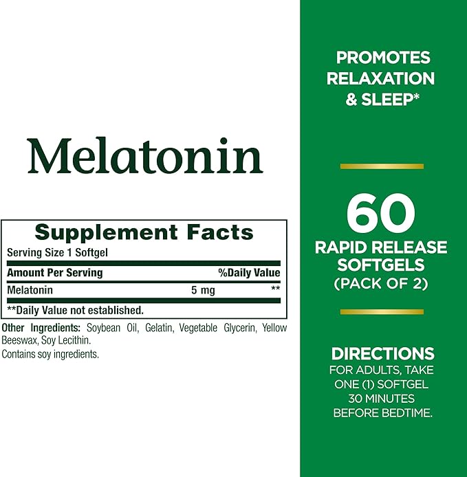 Nature's Bounty Melatonin 5mg, 100% Drug Free Sleep Aid, Dietary Supplement for Relaxation and Sleep Health - 4 Month Supply, 60 Rapid Release Softgels Twin Pack (120ct)