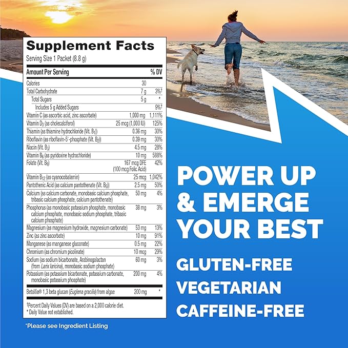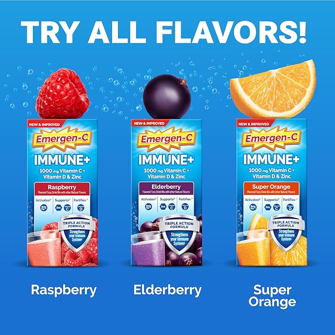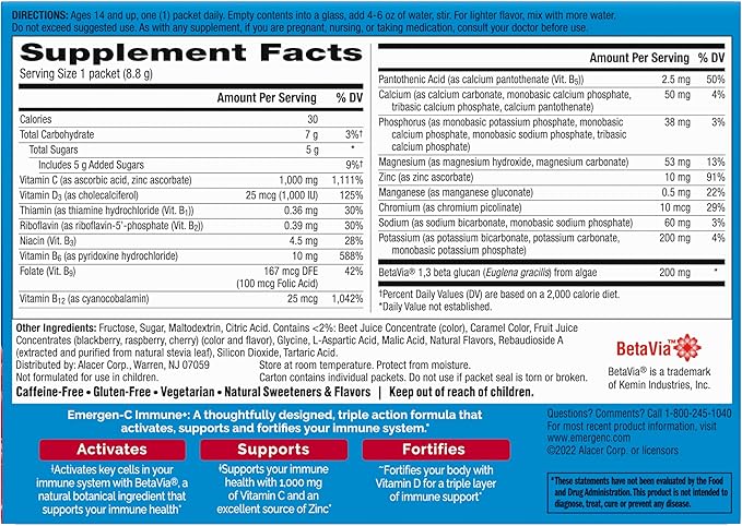 - 30ct of Emergen-C Immune+ Triple Action Immune Support Powder, with 200mg of BetaVia (R), 1000mg Vitamin C per serving, B Vitamins, Vitamin D, Zinc and Manganese (2)