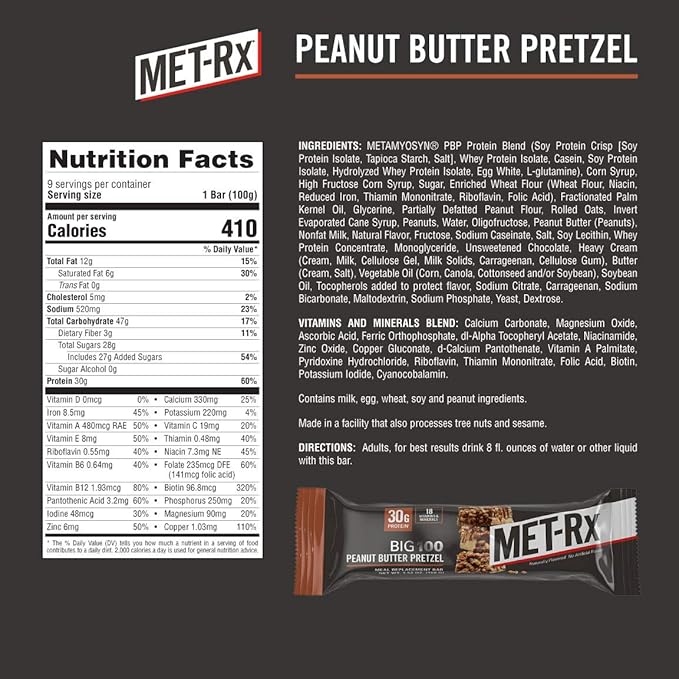 - One 9 count box of MET-Rx Big 100 Protein Bars, Peanut Butter Pretzel