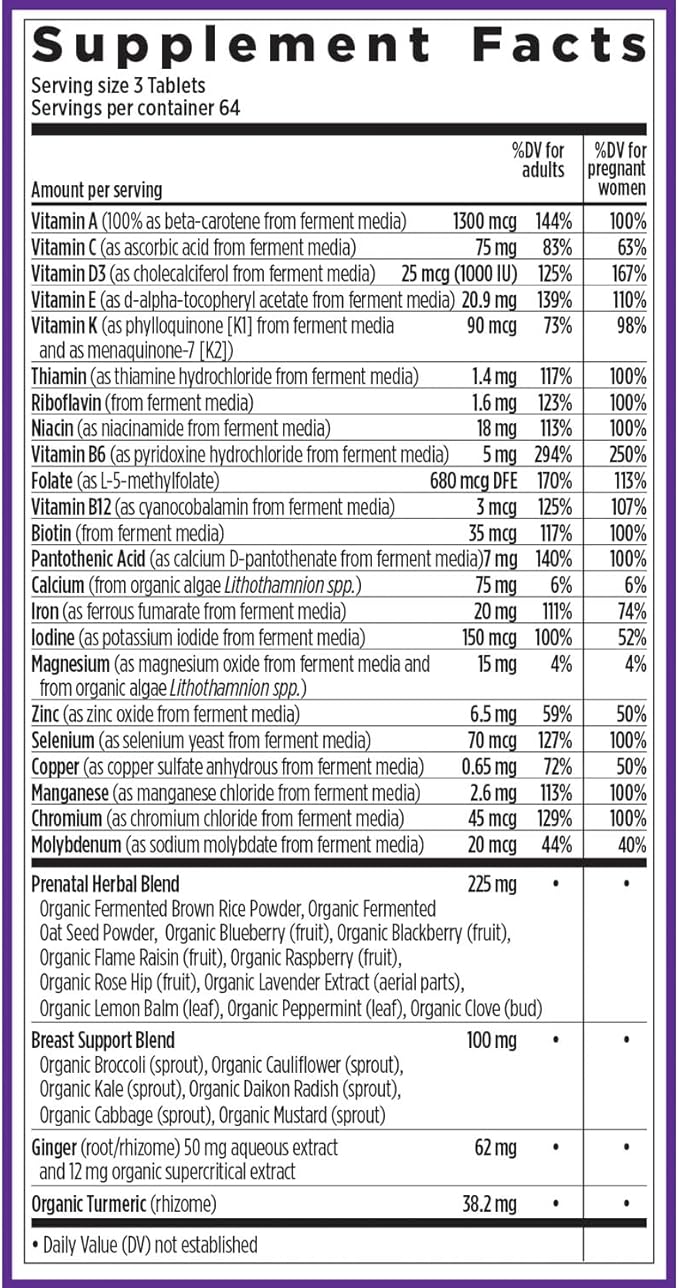 - 3 NUTRIENT-PACKED TABLETS support baby’s healthy development and mom’s healthy pregnancy.*100% Daily Value of Iron, and rich in Folate, B Vitamins, Vitamin D3, Vitamin C, A and Zinc.