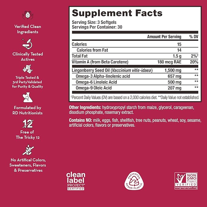 - Lingonberry seed oil contains a healthy ratio of omegas 3, 6, 9 to support healthy skin structure