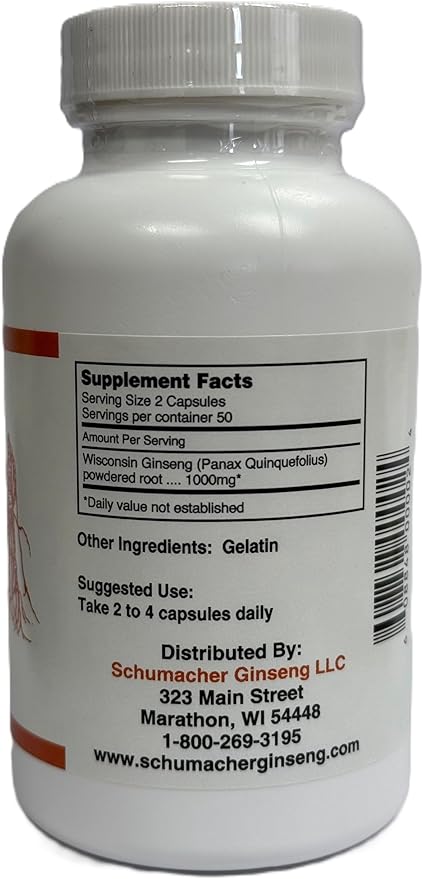 • SCHUMACHER GINSENG American Wisconsin Ginseng Capsules Supplements are made with 100% Premium American Ginseng Roots grown n Marathon County, Wisconsin, USA.