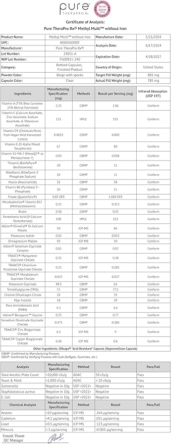 - ππ πππππ πππππ πππππππππππ: Pure TheraPro Rx Methyl Multi without Iron contain no fillers such as rice flour, cornstarch, or wood pulp fibers. Our manufacturing facility adheres to strict NSF/cGMP guidelines. Consumer safety and satisfaction are our highest priority, which is why our products undergo rigorous third-party testing and screening to ensure product purity and potency.