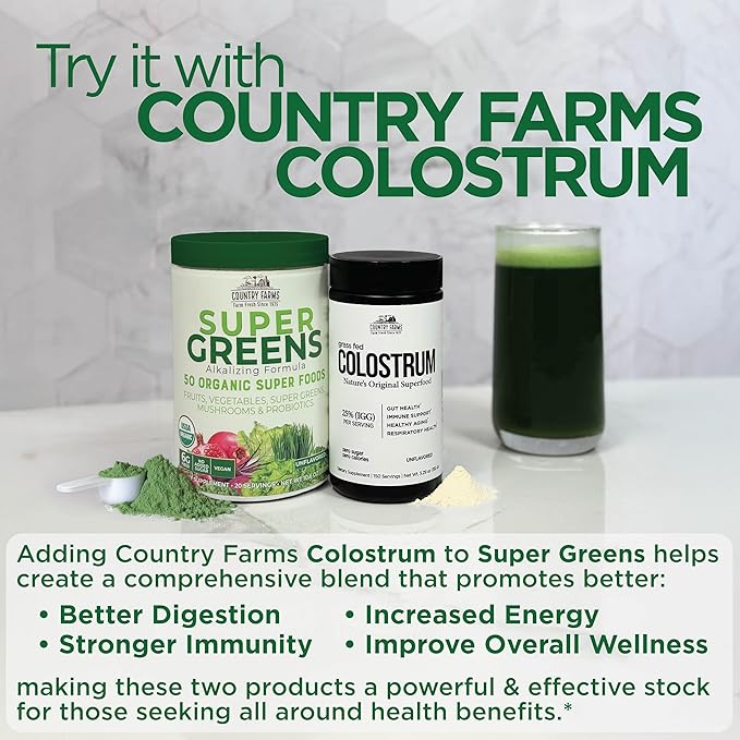 - UNLEASH NATURAL ENERGY. Country Farms Super Greens is a dynamic fusion of 50 premium organic superfoods, carefully chosen to deliver natural energy in every serving. This carefully crafted blend provides a sustainable vitality boost without the jitters or crashes associated with artificial stimulants. Unleash your natural energy with Country Farms Super Greens.