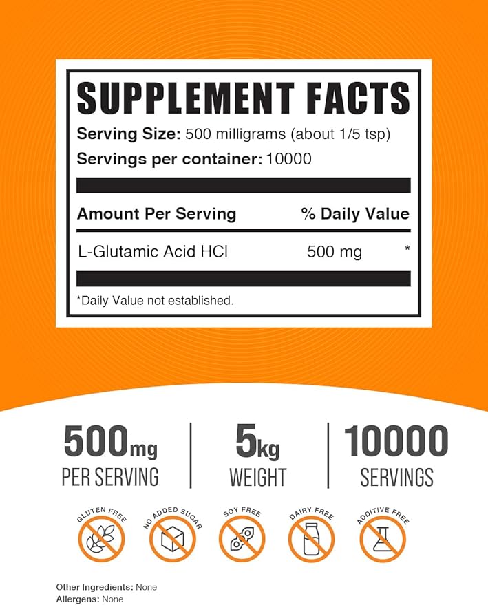 BulkSupplements.com L-Glutamic Acid HCl Powder - Amino Acids Supplement for Brain Health - Gluten Free - 500mg per Serving, Pack of 5 (5 Kilograms - 11 lbs)