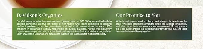 - TRUST OUR TEA: Davidson's Organics was the first purveyor of fine organic teas. Since 1976, we’ve worked tirelessly to develop blends that are true reflections of their names, while being committed to sourcing healthy ingredients grown by generations of skilled small farmers. Enjoy Davidson's Organics, the organic tea that sets the standards for the highest quality.