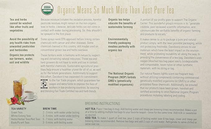 - ALWAYS ORGANIC: Davidson’s Organics is a 3rd generation organic tea grower delivering on its promise of providing top-notch USDA certified organic teas. Our teas are grown non-GMO & free from harmful chemicals and pesticides. We are responsibly sourced and sustainably farmed. We believe in the holistic health of our farms, farmers, plants & animals.