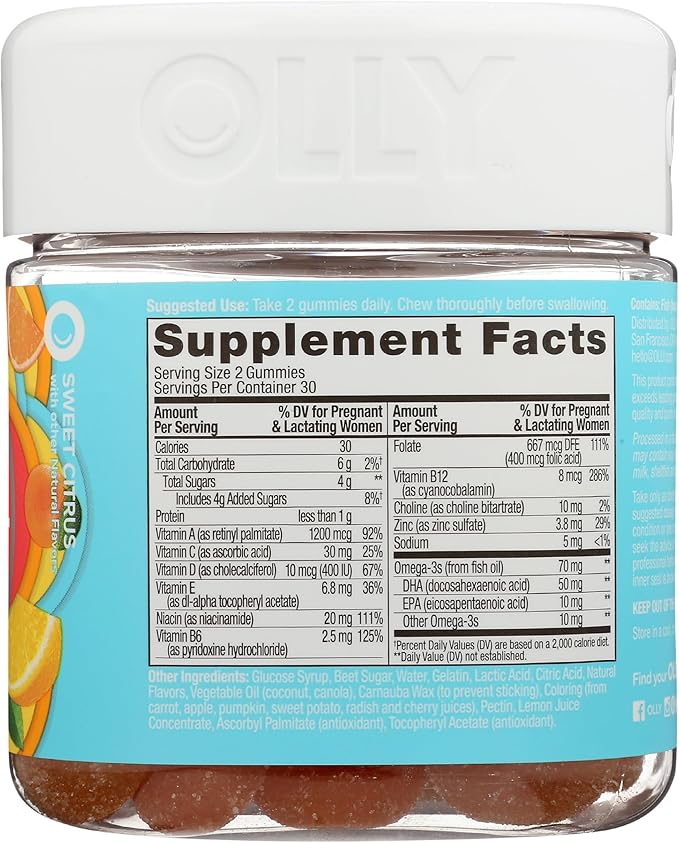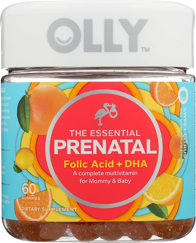 Olly The Essential Prenatal Gummy Multivitamin, 30 Day Supply ( Gummies), Sweet, Folic Acid, Vitamin D, Omega 3 DHA, Chewable Supplement, White Citrus, 60 Count (Pack of 1)