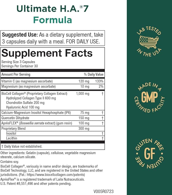 - CLINICALLY TESTED DOSE – Ultimate H.A. 7 features 1000 mg of BioCell Collagen, the exact amount used in clinical research.