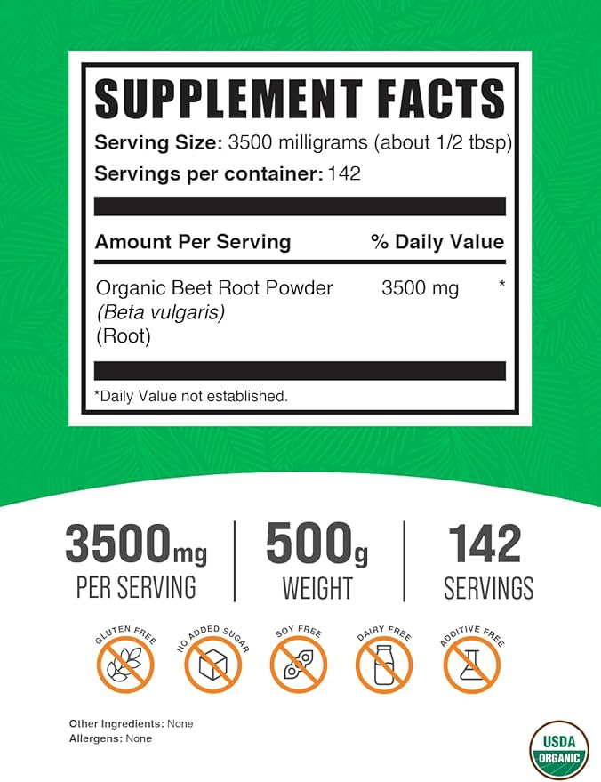 BulkSupplements.com Organic Beet Root Powder - Beet Powder Organic, Beetroot Supplement - Superfood Supplement, Vegan & Gluten Free - 3500mg per Serving, 500g (1.1 lbs) (Pack of 1)