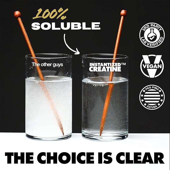 - 100% SOLUBLE CREATINE - Using our fine mesh system, we are able to deliver 100% soluble creatine monohydrate which dissolves completely in liquid for rapid absorption and lean “Bloat free” muscle. This instantized creatine eliminates bloating, water retention, and the terrible gritty, chalky taste you get with other micronized creatine monohydrate.