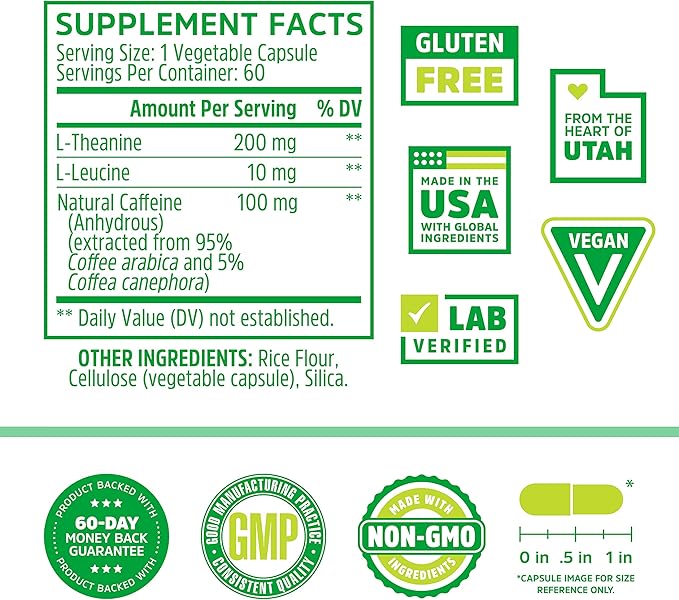 - SMOOTH & FOCUSED ENERGY. Looking for long lasting energy without the harsh side effects of other caffeinated products? Our combination of caffeine (100mg) and L-theanine (200mg) works together to produce a smooth and clean energy without the crash.