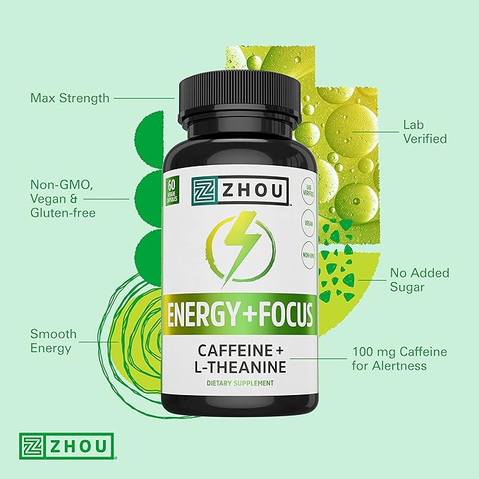 Zhou Natural Caffeine Pills 100mg with L-Theanine 200mg, Nootropic Supplement, Clean Energy, Endurance and MentalFocus, Non-GMO, Vegan, Gluten-Free, 60 Capsules