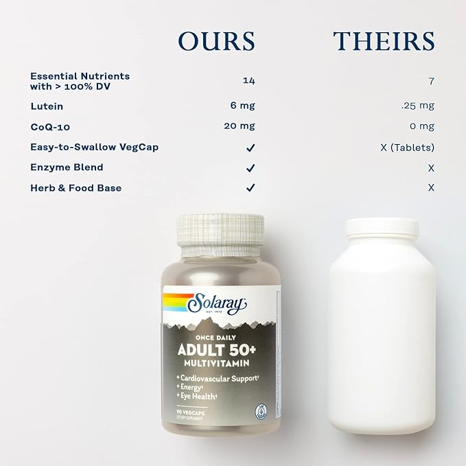 Solaray Once Daily Adult 50+ Complete Multivitamin for Women & Men, Essential Vitamins & Chelated Minerals for Healthy Energy, Heart, Brain & Immune Support, With CoQ10 & Lutein, Iron Free, 90 VegCaps