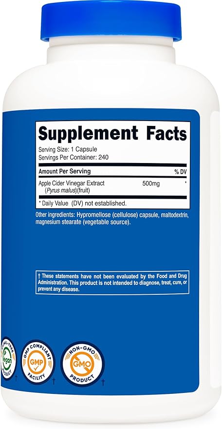 - 500mg of Apple Cider Vinegar Per Capsule and Includes "The Mother"