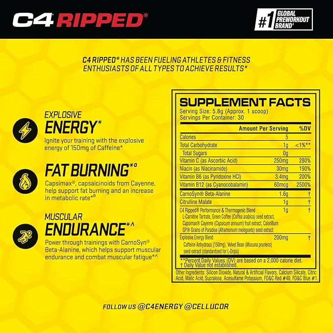 Cellucor C4 Ripped Pre Workout Powder for Energy | Beta Alanine, Sugar Free Energy Supplement Preworkout for Men & Women - 150mg Caffeine + Creatine-Free, Raspberry Lemonade 30 Servings