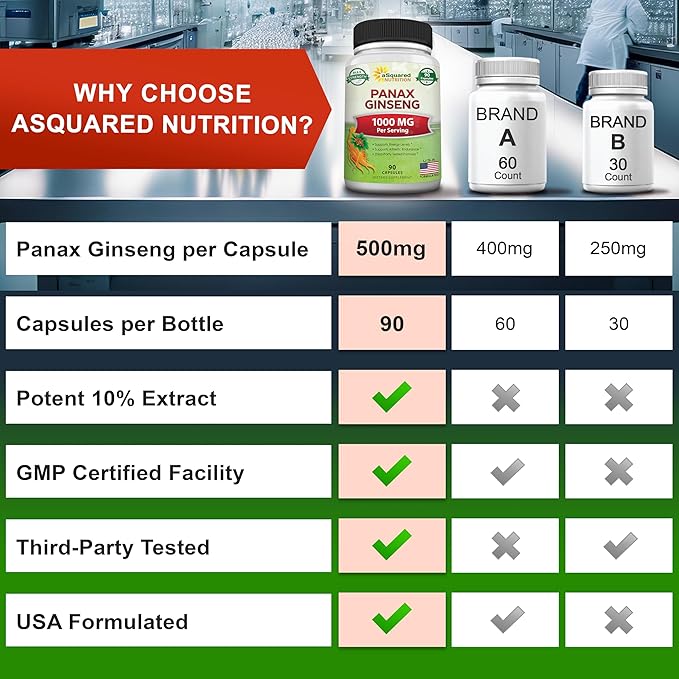 - Non-GMO & Third-Party Tested: Each bottle contains 90 easy-to-swallow capsules containing 500mg of Panax Ginseng per capsule. Each bottle provides a full 45-day supply at 1000mg of Panax Ginseng per day. Our formula is non-GMO, is Formulated in the USA, and is third-party tested in an ISO 17025 certified lab to ensure purity, potency, & safety you can trust.