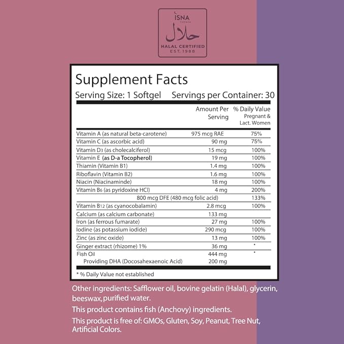 - Halal prenatal vitamins with DHA and Folic Acid (folate), formulated to support developing baby's brain and entire body.