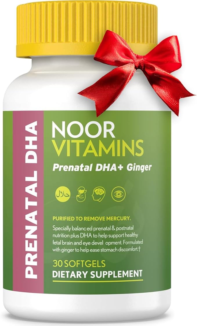 Noor Vitamins Halal Prenatal Vitamins with DHA and Folic Acid, Essential Vitamins, Ginger to Soothe Mom's Stomach, Iron, Softgels, Prenatal Vitamin Before/During/Post Pregnancy (1 Month Supply)