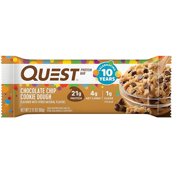 - YOU DESERVE A SPECIAL TREAT: The Quest Chocolate Chip Cookie Dough Protein Bar tastes like a scoop of cookie dough fresh from the bowl. Only our version is packed with chocolate flavored chips and has 21g protein 4g net carbs and 1g sugar