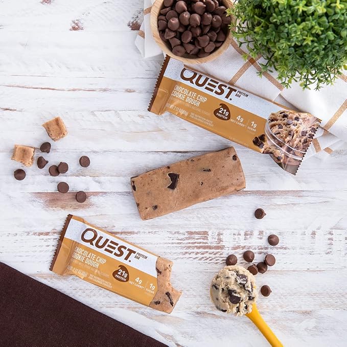 - COMFORT FOODS FOR ANYTIME CRAVINGS – [insert any bar flavor] The Quest Chocolate Chip Cookie Dough Protein bar is a sweet treat, without all the sugar, you can enjoy whenever you want to satisfy your sweet tooth.Box contains 20 Chocolate Chip Cookie Dough flavored Quest Bars