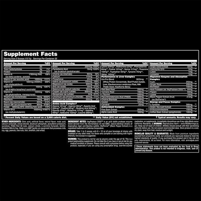 - Complete Nutrition, 8 Essential Products in 1: Containing multiple vitamins, minerals, amino acids, antioxidants, digestive enzymes, carnitine, and much more, Animal Pak is the cornerstone for any athlete’s nutrition