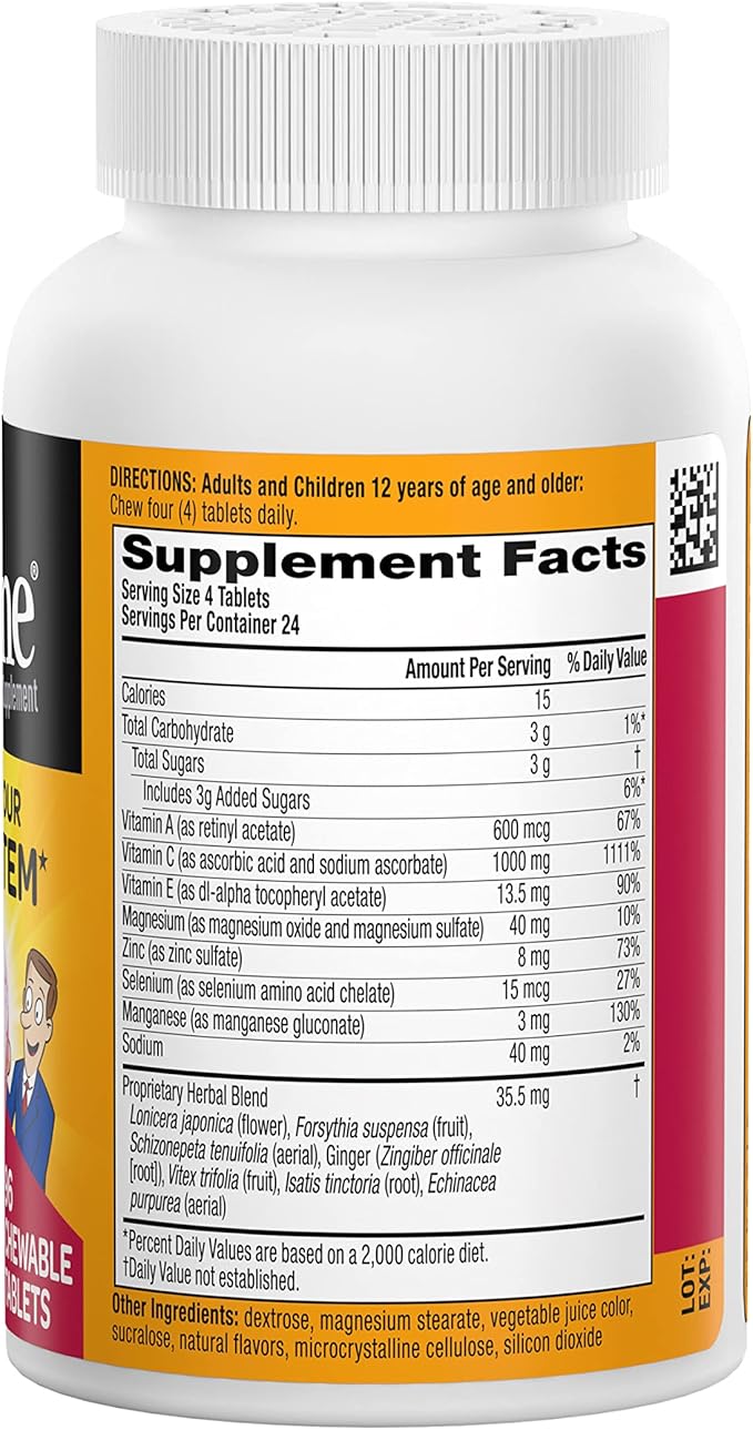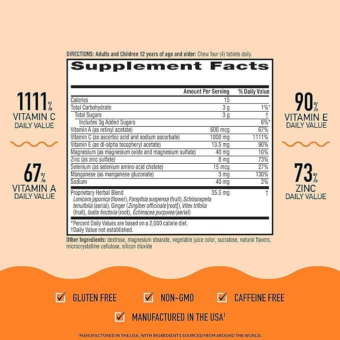 - ZINC SUPPLEMENT: These Chewable Vitamin C with Zinc tablets contain 73% of your daily value of Zinc, which plays a central role in your immune system and is essential for the functioning and signaling of immune cells.*
