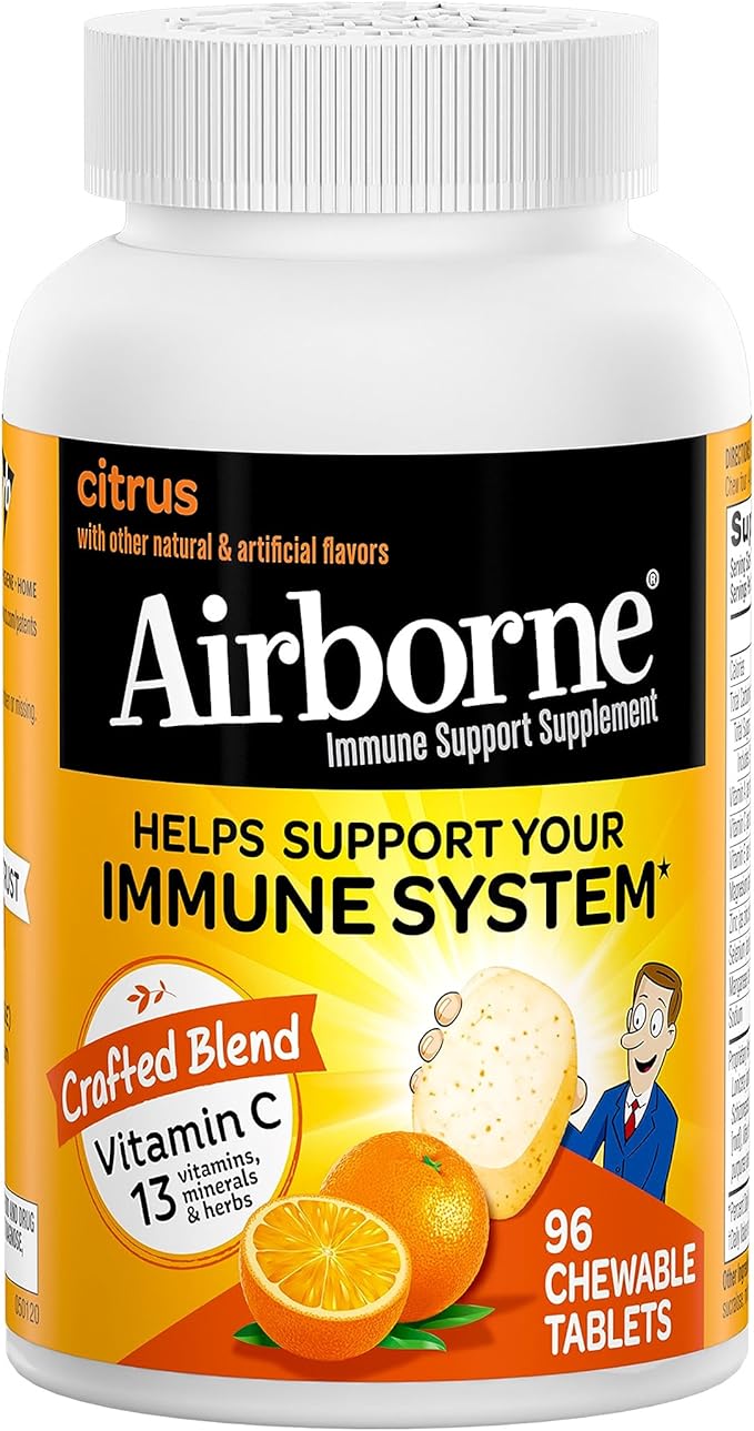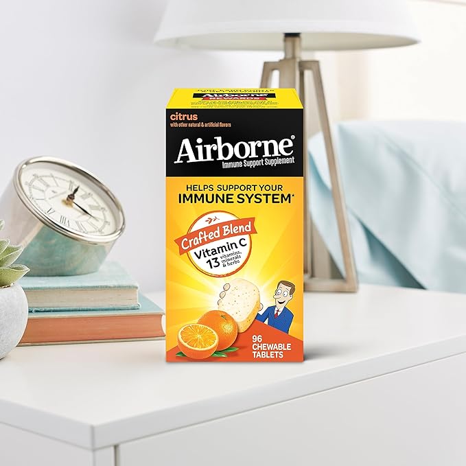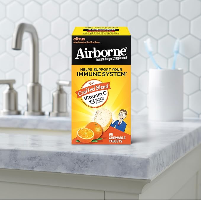 Airborne 1000mg Chewable Tablets with Zinc, Immune Support Supplement with Powerful Antioxidants Vitamins A C & E - 96 Tablets, Citrus Flavor