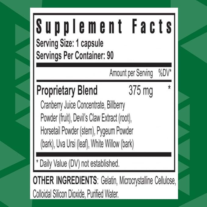 - Proprietary Blend » Cranberry Juice Concentrate, Billberry Powder (fruit), Devil Claw Extract (root), Horsetail Powder (stem), Pygeum Powder (bark), Uva Ursi (leaf), White Willow (bark).