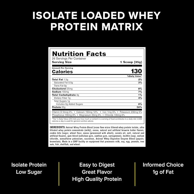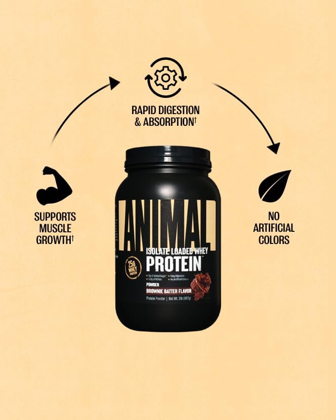 Animal Whey Isolate Protein Powder - Loaded for Pre & Post Workout Muscle Builder and Recovery with Digestive Enzymes for Men & Women - 25g Protein, Great Taste, Low Sugar - Brownie Batter 2 lbs