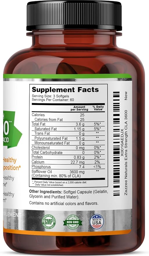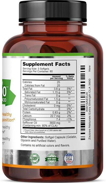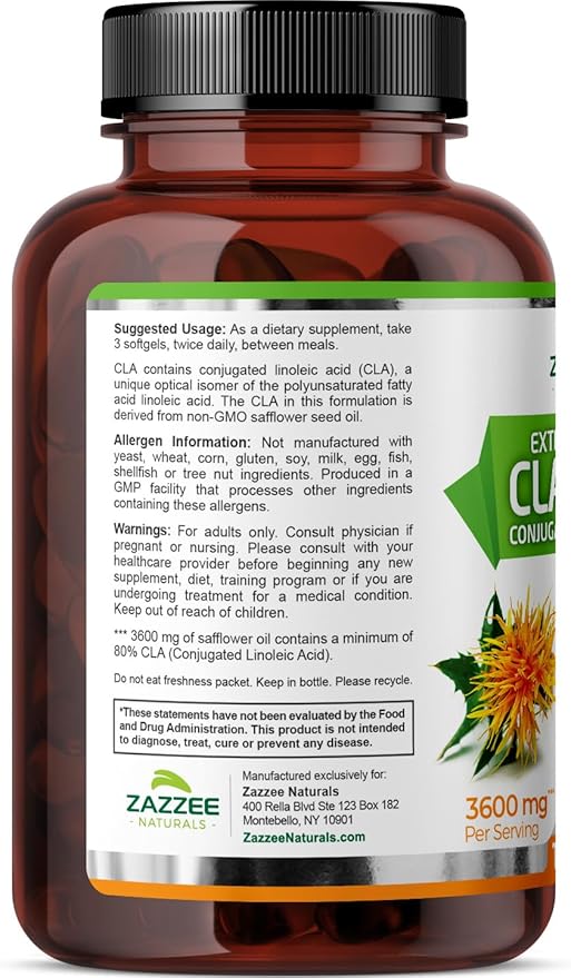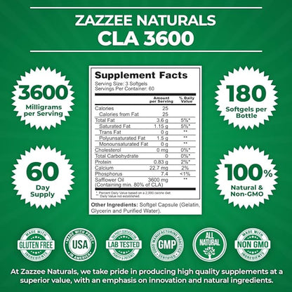 Zazzee High Potency CLA 3600, 180 Softgels, 3600 mg per Serving, Conjugated Linoleic Acid from Safflower Oil, Concentrated and Standardized, 60 Day Supply, Non-GMO and Made in The USA