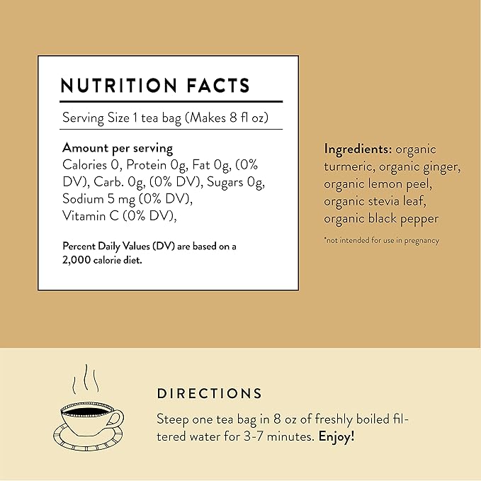- Ingredients: organic turmeric root, organic ginger root, organic lemon peel, organic stevia leaf, organic black pepper