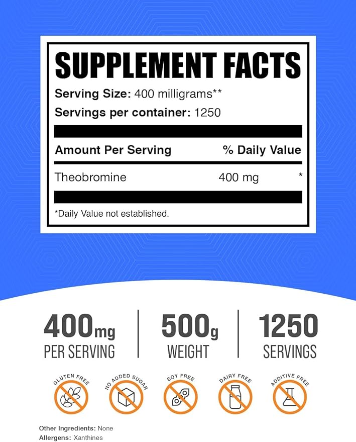 - Optimized in every Serving: Our Theobromine 400mg powder, a nootrophic supplement, is unflavored and free of unnecessary allergens, offering you a high-quality product that easily integrates with other supplements or your preferred shake or beverage.