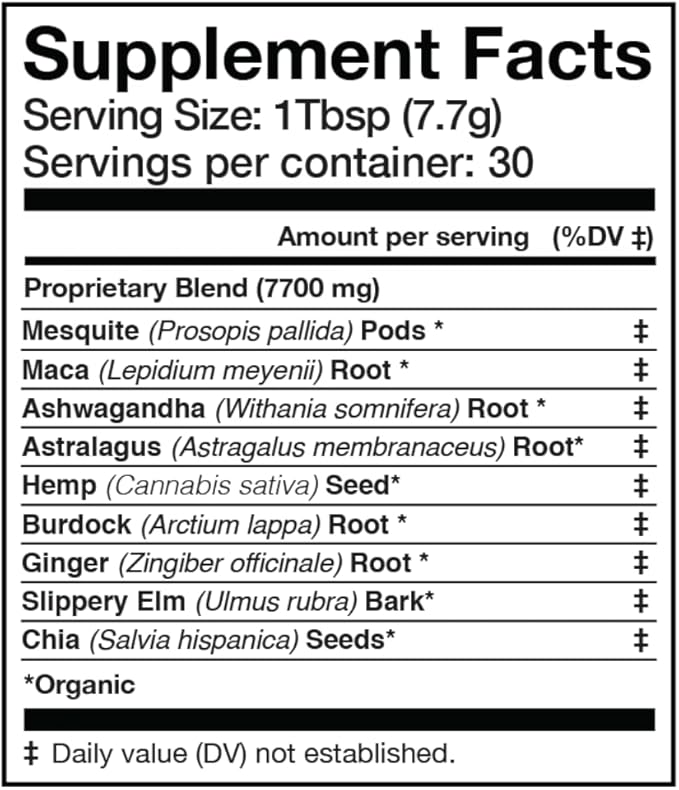 - Ingredients - Mesquite (Prosopis pallida) Pods*, Maca (Lepidium meyenii) Root*, Ashwagandha (Withania somnifera) Root*, Astragalus (Astragalus membranaceus) Root*, Burdock (Arctium lappa) Root*, Ginger (Zingiber officinale) Root*, Slippery Elm (Ulmus rubra) Bark*, Chia (Salvia hispanica) Seed*