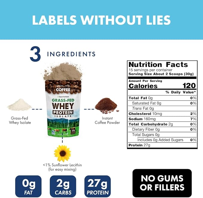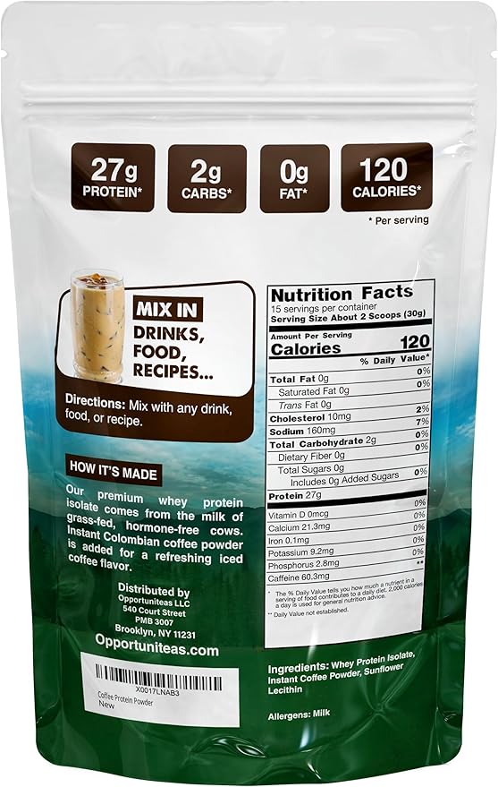 - COLOMBIAN COFFEE + PREMIUM PROTEIN - We combine dark roast Colombian coffee powder with premium whey protein isolate without any sweeteners or flavorings. Our whey protein starts as milk from grass-fed pasture raised cows from New Zealand. We use low-temperature processing to purify the protein and maximize the nutritional benefits.