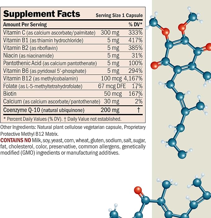 - SUPERIOR BIO-ACTIVE INGREDIENTS – Provides the finest, natural source of CoQ10, world’s most sophisticated high potency B-complex formula, including our absorption-protected Natural B12, vitamin C and Calcium. Contains NO Milk / Dairy-Free, Gluten Free; NO soy, yeast, corn, wheat, sodium, salt, sugar, fat, cholesterol, color, preservative, common allergens or manufacturing additives.